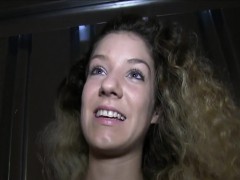 Curly babe swallows cum in public